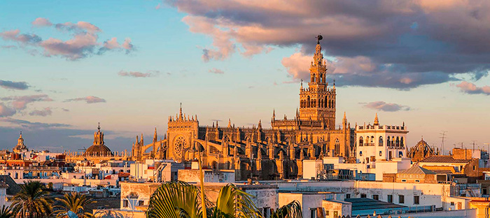 Una vista panorámica de la Catedral de Sevilla y su emblemática Giralda al atardecer. La cálida luz del sol ilumina la estructura gótica y renacentista, resaltando los detalles de su fachada y creando una atmósfera dorada sobre los tejados de la ciudad. https://shre.ink/tB5a
