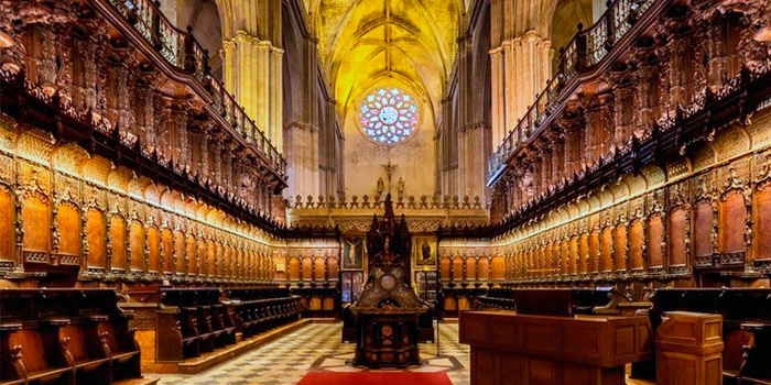 Una espectacular vista del interior de la Catedral de Sevilla, mostrando el coro y las elaboradas bóvedas. La majestuosidad de la arquitectura gótica y la iluminación dorada crean un ambiente sobrecogedor, reflejando la riqueza artística e histórica del templo. https://shre.ink/tBq9