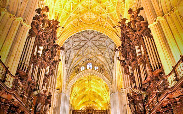 El interior de la Catedral de Sevilla, mostrando los impresionantes órganos de la nave principal, con sus elaboradas tallas de madera y tubos dorados. La luz dorada que ilumina el espacio realza la belleza de la arquitectura gótica y renacentista, y crea una atmósfera de majestuosidad y solemnidad. https://shre.ink/tBAA