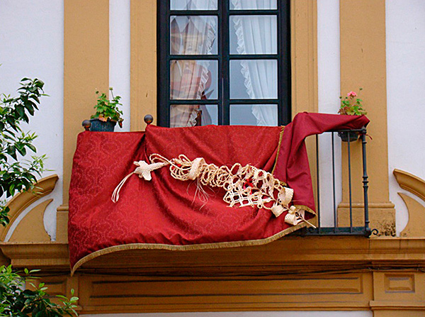 Balconeras: En muchas ciudades andaluzas, es costumbre que los vecinos cuelguen en sus balcones telas con el escudo de la cofradía que va a pasar por su calle o balconeras de terciopelo. Esto no solo es una muestra de devoción, sino que también añade un colorido y solemne a la calle.