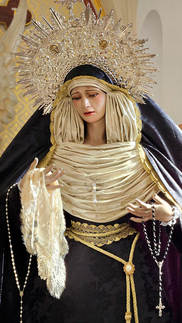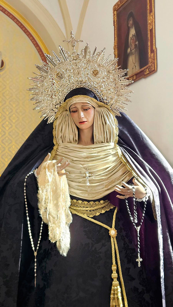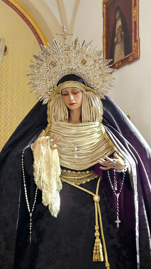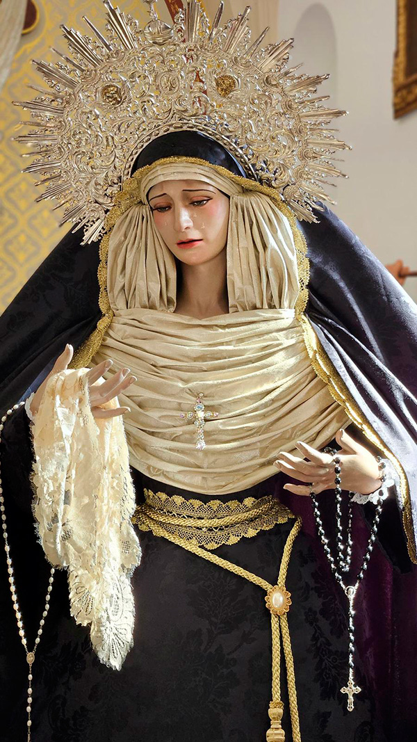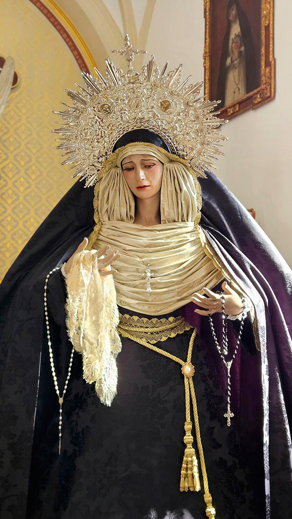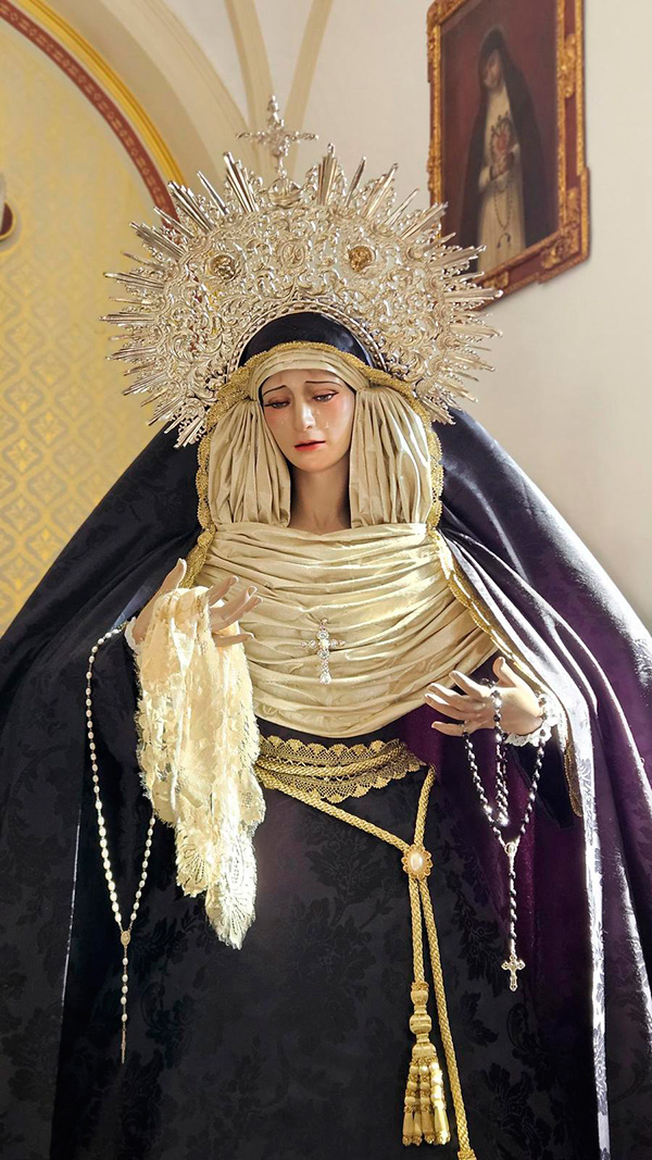 El vestidor Miguel Ángel Padilla se ha encargado de ponerle sus ropas oscuras, con mucho cariño y cuidado. Todo está pensado para que la Virgen refleje el respeto y el recogimiento propios del mes de los difuntos.