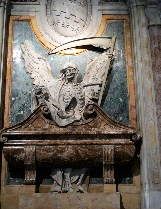 Lápidas de mármol con escudos de armas, epígrafes latinos y calaveras aladas.